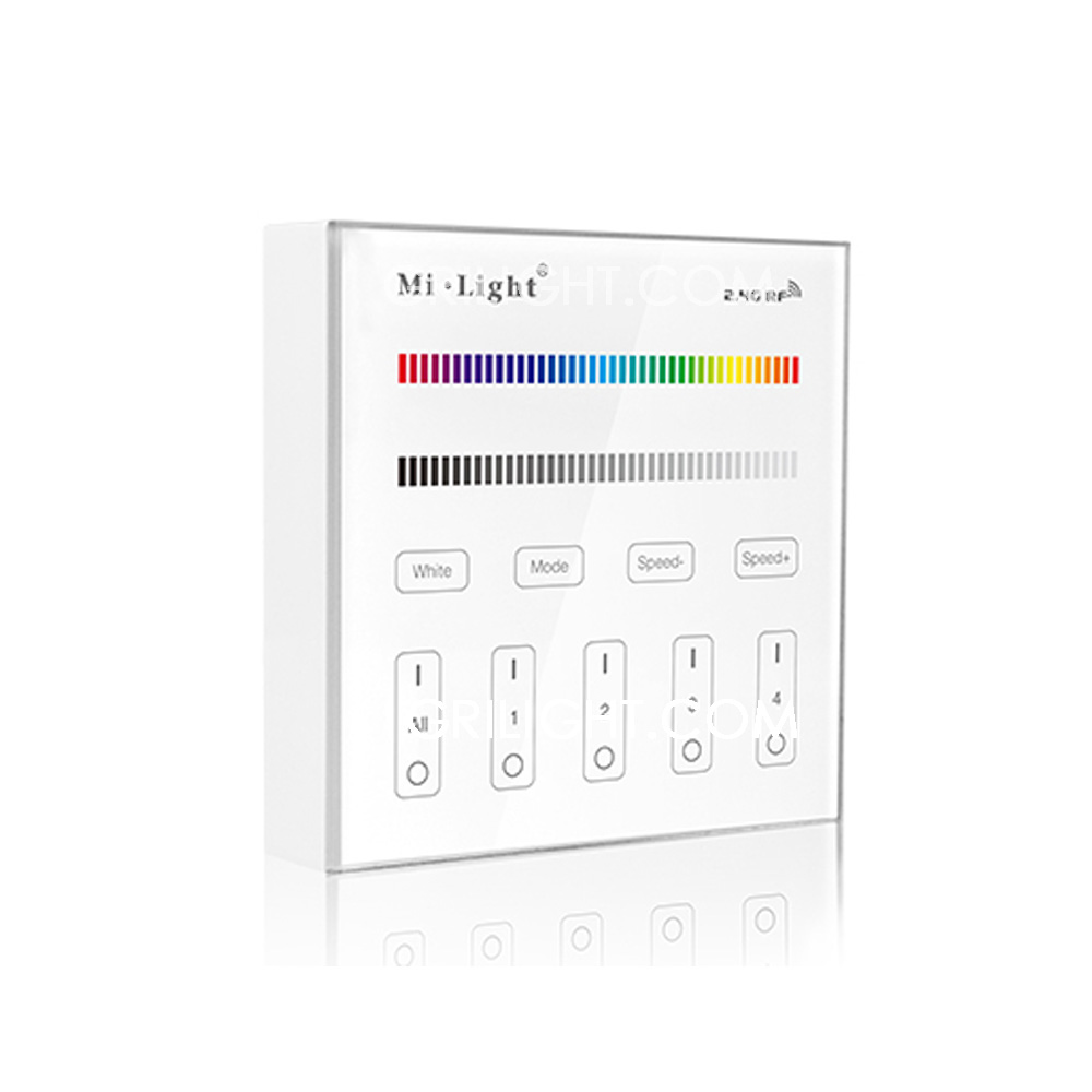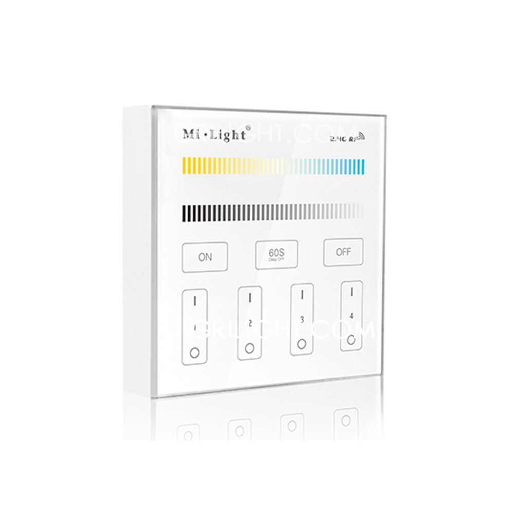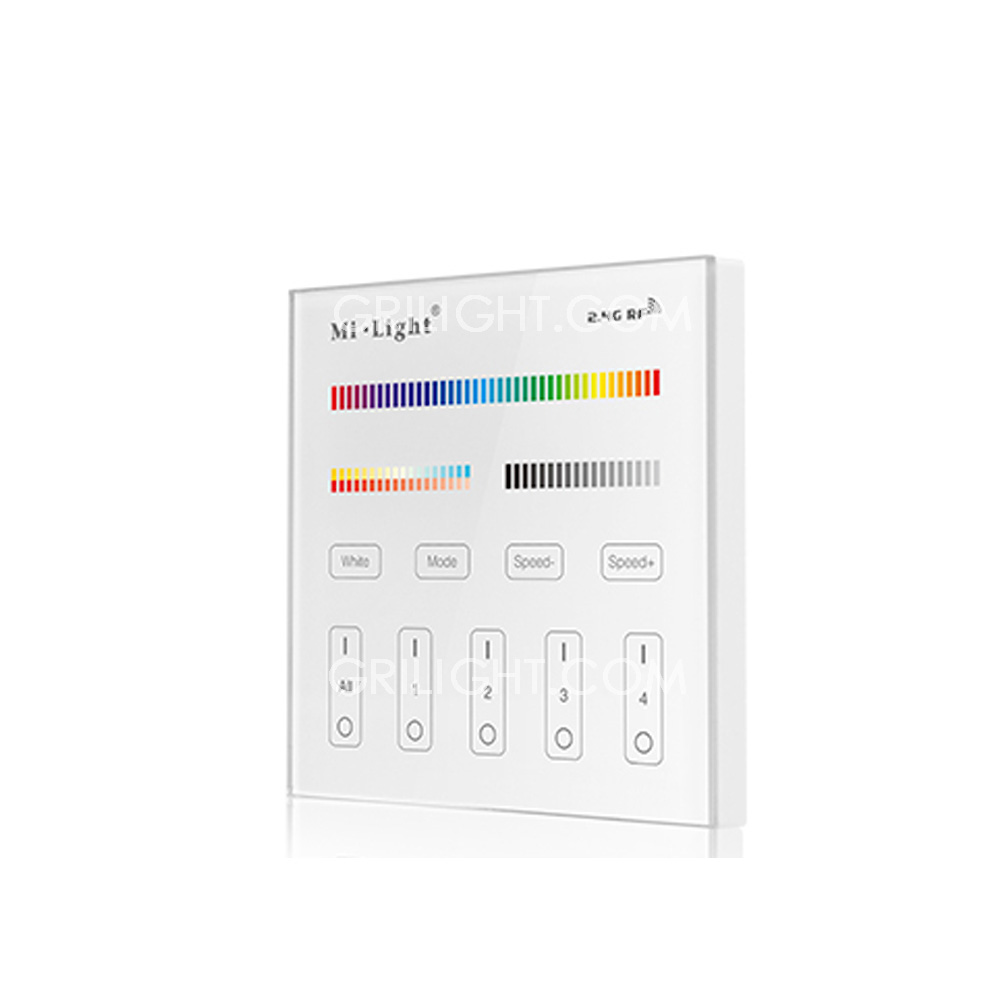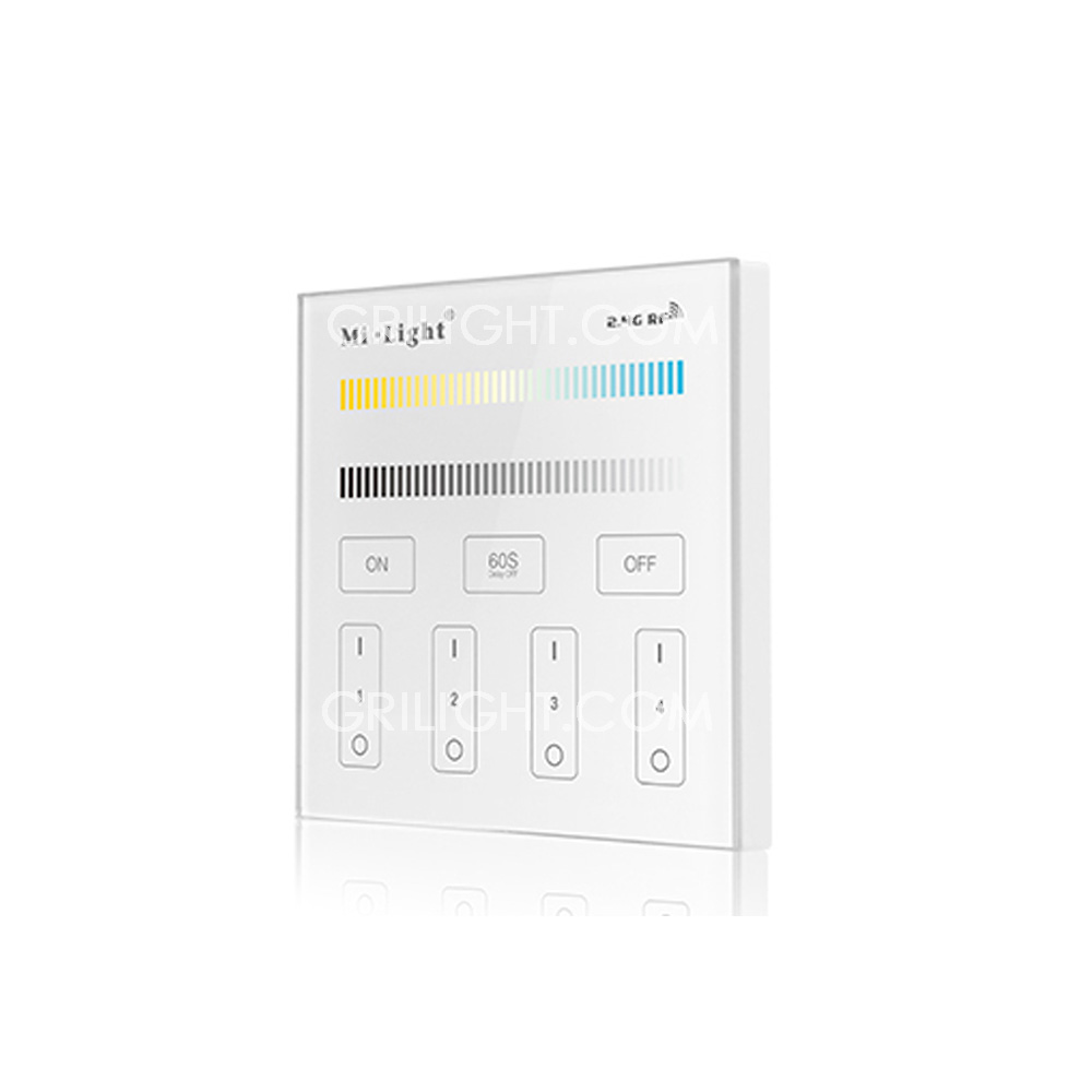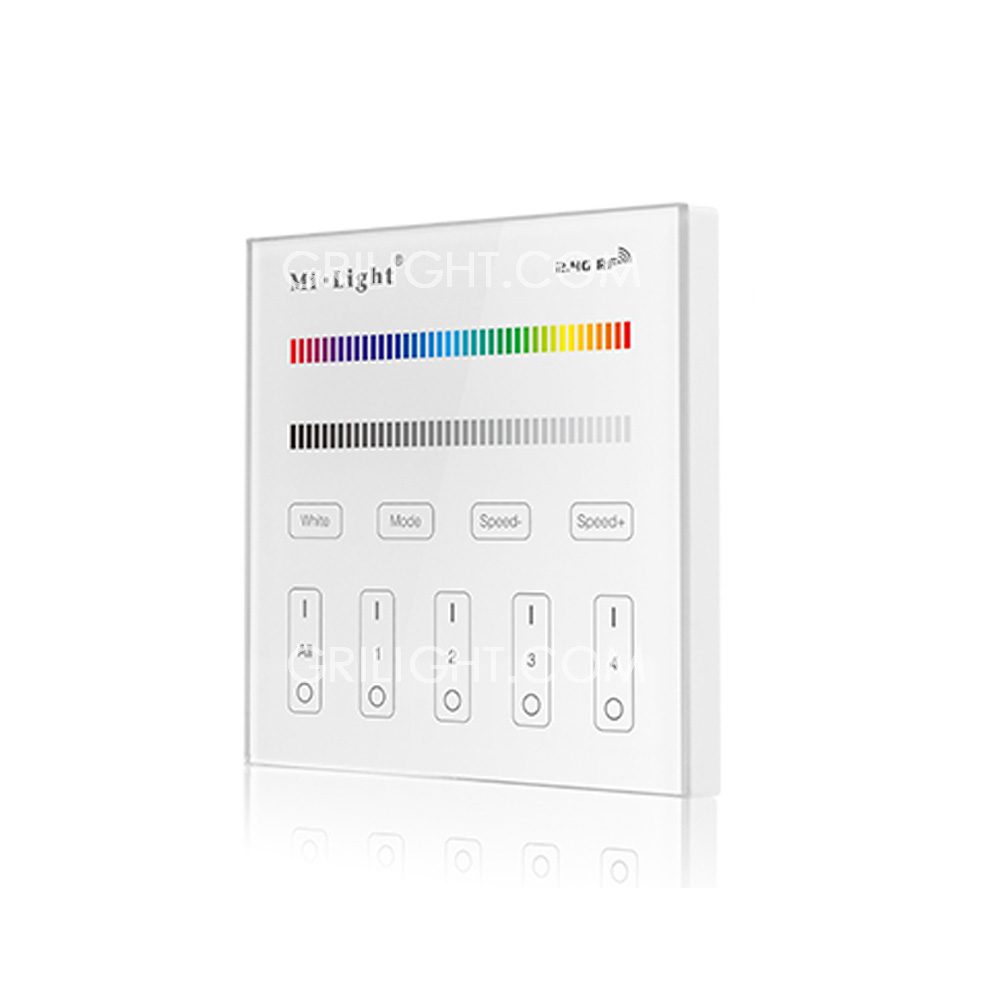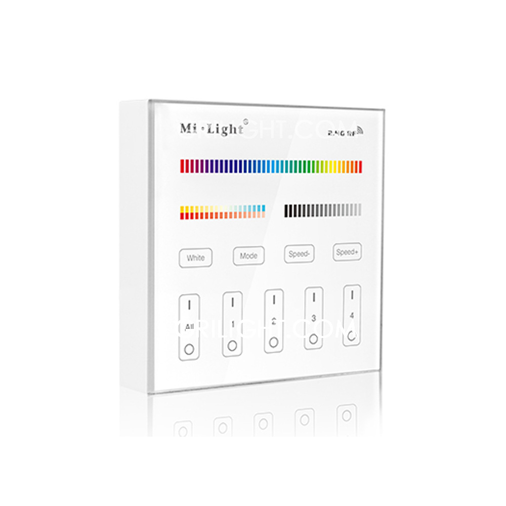 MiLight T4 RGB+CT Touch Panel Remote. Wall mounted type. It worked as only a remote to the controller. Can control Mi Light sereis RGB+CT controller and bulbs. Control distance 30mtrs